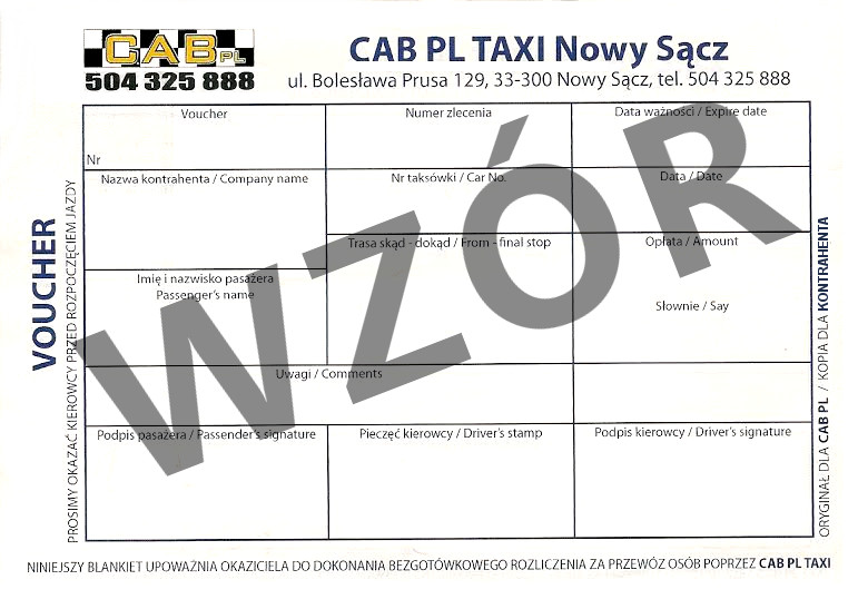 Nie zapominając o naszych klientach indywidualnych, przygotowaliśmy ofertę własnie pod ich kątem na przedpłacone vouchery CAB PL. Nasze vouchery dla klientów indywidualnych to idealne rozwiązanie dla Ciebie oraz Twojej rodziny. Jeżeli posiadasz już kartę GOLD lub SILVER to dodatkowe vouchery będą tak samo wygodne oraz korzystne. Nasze vouchery to super opcja bezgotówkowa dla rodziców chcących aby ich dzieci lub rodzina bezpiecznie podróżowały w ramach taxi na terenie Nowego Sącza i okolic bez konieczności płacenia gotówką. Nasza firma CAB PL Group ® wprowadza ten system jako pierwsza na rynek Beskidu Sądeckiego dla Państwa komfortu. Proste i komfortowe rozwiązania to nasza domena. Komfort i luksus to już znana marka całej grupy. Jesteśmy dumni że możemy wspierać lokalny biznes a zarazem dbać o klientów indywidualnych w naszym regionie. Aby zamówić nasze PRE-Paid Vouchery – należy wypełnić prosty formularz. Serdecznie Zapraszamy.
